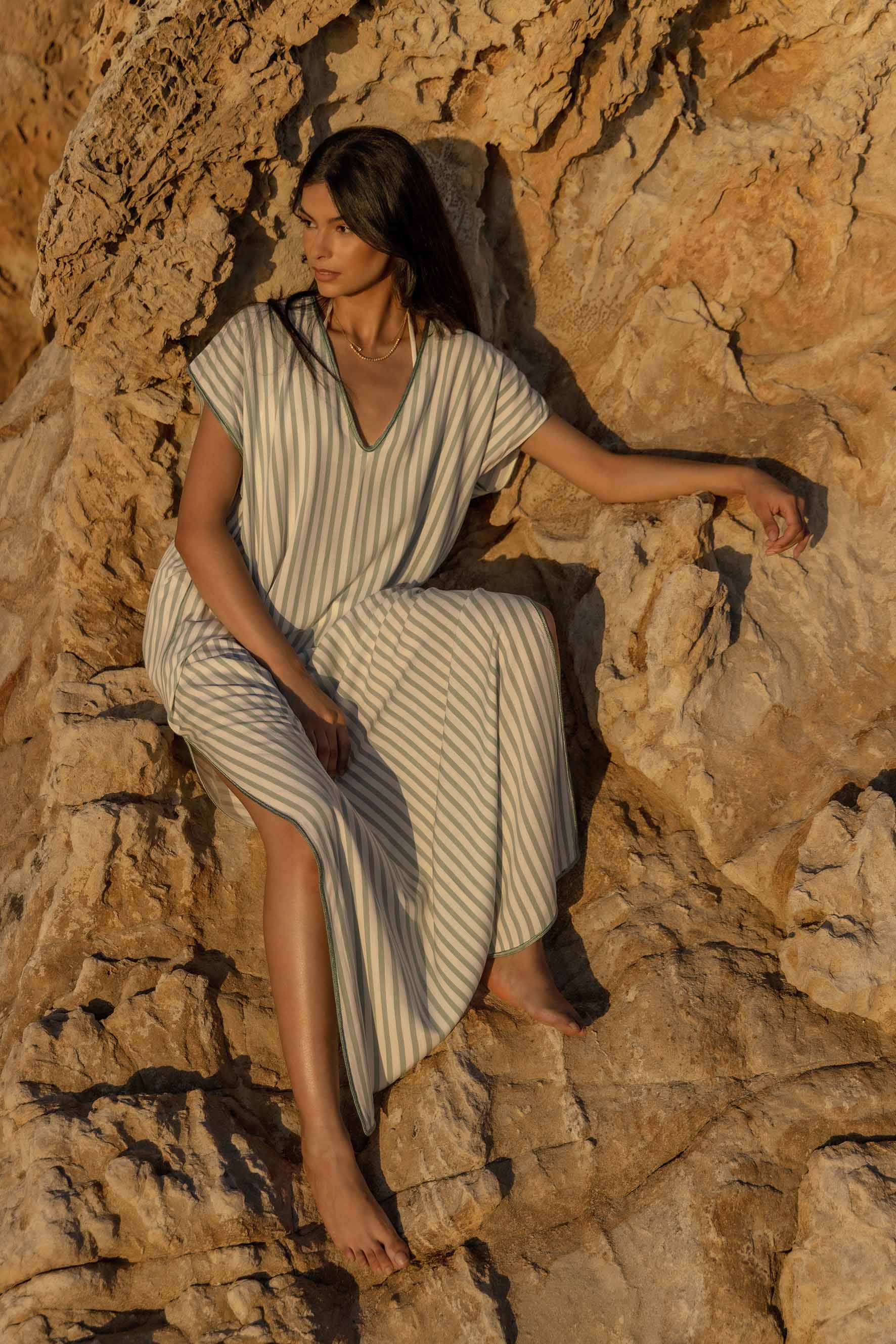 Named after the iconic Villa Mabrouka in Tangier, this striped kaftan channels effortless summer grace.