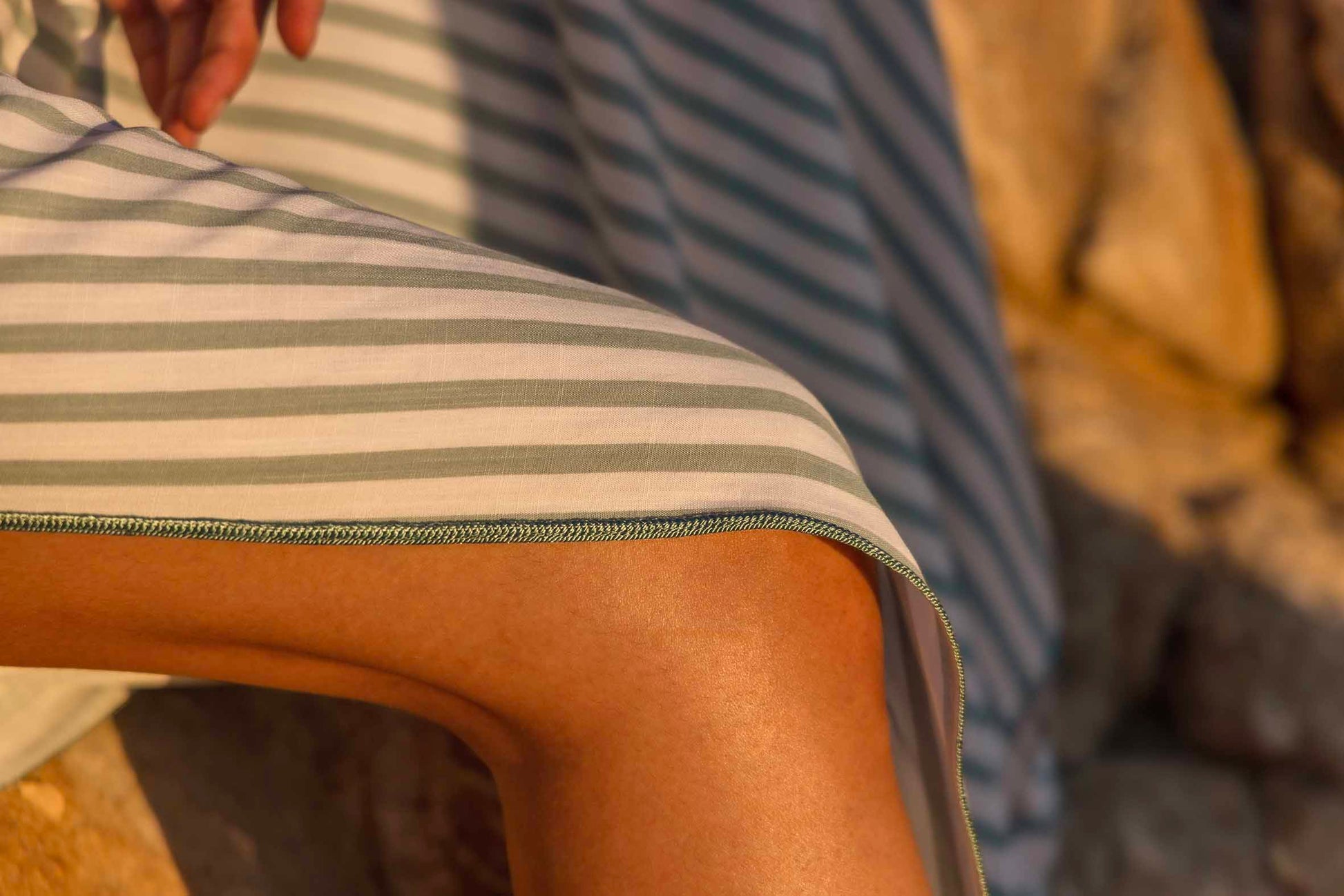 Cut in soft, breathable cotton with natural beige and sage tones, it blends coastal ease with timeless Moroccan elegance.